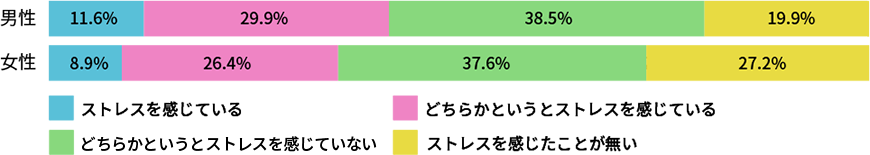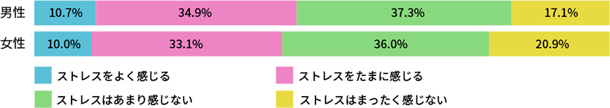 「ストレスを感じている」「どちらかといえば、ストレスを感じている」と回答された男性は2020年から2021年のあいだに5%程度、女性は10%程度増加しています。