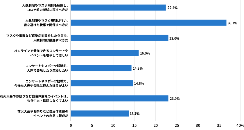 アンケート結果で最も多かった回答は「数制限やマスクの着用を行ったうえで、密を避けて開催すべき」というもの。開催については問題ないようですが、一定以上の感染対策はしてほしいという声はまだまだ根強いようです。ですが、「コロナ以前の状態に戻すべきか」という視点でアンケート結果の比率を見てみると「人数制限の撤廃や大声での合唱・応援をしたい」「イベントの中止や延期をしなくてもよい」という意見が82.7ポイントとなりました。逆に「まだまだ規制・自粛は継続するべき」「オンラインで行う方が良い」という意見も81ポイントとなっており、人が集まりやすいイベントに関しては、このように賛成派と反対派の意見が拮抗していることがわかります。コロナ以前に戻したい声もある一方で、感染リスクは下がるわけではないため、それを不安に思っている人も多いことがうかがえます。