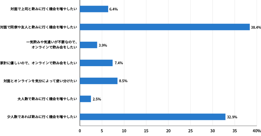 調査の結果を見ると、オフラインでの飲み会を希望する声は80.2%となっており、コロナ収束後は、オフラインでの交流を増やしたいと思う人が非常に多いということがわかります。慎重な声はあるものの、規模や状況によっては、5類への移行は世論として概ね賛成の傾向にあるのかもしれません。