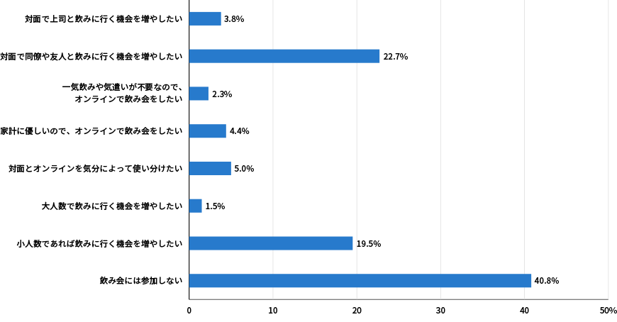 「飲み会に参加しない」という選択肢を除き、最も多かったのは「対面で同僚や友人と飲みに行く機会を増やしたい」の22.7%、続けて「少人数であれば飲みに行く機会を増やしたい」の19.5%と、4割強の回答がオフラインでの飲み会を希望する結果となりました。対して積極的に『オンライン飲み会』を選択する回答は全体の10%にも満たない結果となっています。アンケート結果をみる限り、どうやら『オンライン飲み会』という文化は特に定着することなく流行が去ってしまったようですね。