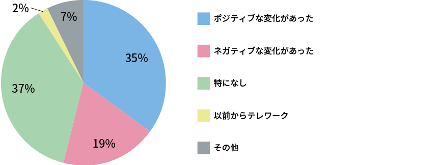最も多かったのは意外にも「変化は特になし」で37%、僅差で「ポジティブな変化があった」と回答された方が35%、逆に「ネガティブな変化があった」と回答された方は19%となりました。