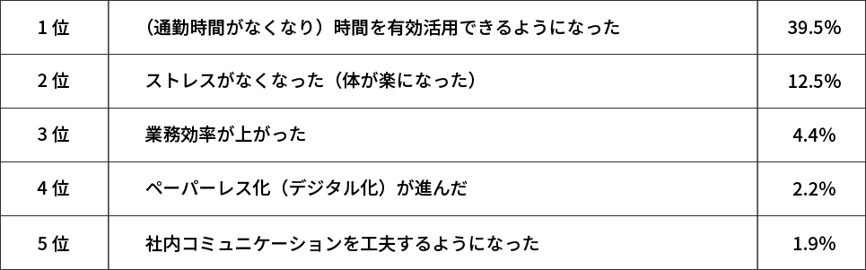 最も多かった回答は「(通勤時間がなくなり」時間が有効活用できるようになった」でした。通勤時間をなくせるというのは、テレワーク最大のメリットといってもいいかもしれません。また、「満員電車や人間関係によるストレスがなくなった」「体が楽になった」と感じる方も多いようです。