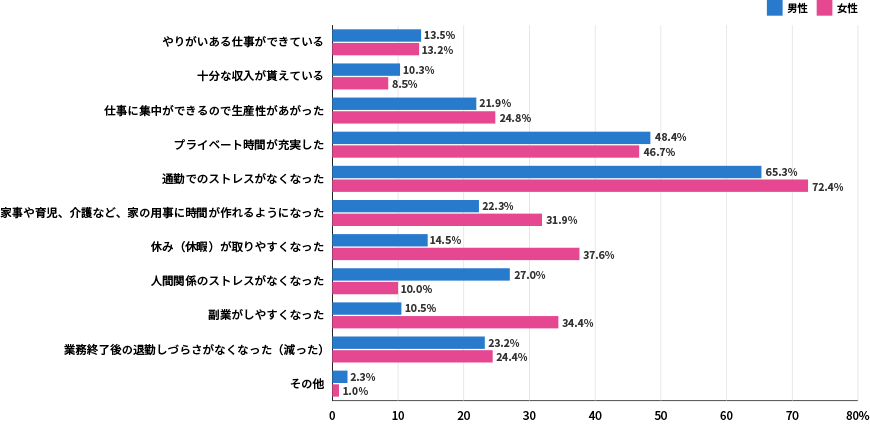 2020年のアンケート同様、今回のアンケートでも「通勤でのストレスがなくなった」という意見が最も多い結果となりました。男女ともに前回から5%以上割合が増えており、満員電車で移動するストレスに加え、2021年は長引くコロナ禍によって感染不安を抱える方が増えたことからテレワークで通勤がなくなることへのメリットを感じる割合が増えた可能性がありそうです。