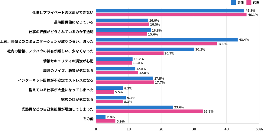 こちらもメリットと同様、2020年のアンケートに引き続き、今回のアンケートでも「仕事とプライベートの区別ができない」という意見が最も多い結果となりました。前回と比較し、特に女性からの意見が増えていることが分かります。