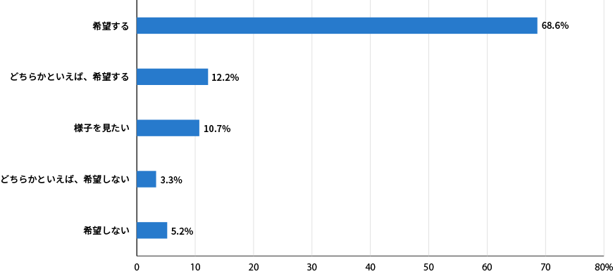 最も多かったのは「希望する」と回答された方で68.6%、「どちらかといえば希望する」と回答された方を合わせると、前向きにワクチン接種を検討されている(もしくは接種を済ませた)方が80%を占めることになります。