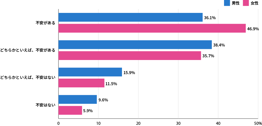 男性の回答で最も回答が多かったのは「どちらかといえば不安がある」が38.4%、女性は「不安がある」が46.9%、男女ともにこれらの意見を合わせると男女ともに70%以上の方が副反応について不安を抱えていらっしゃるようです。