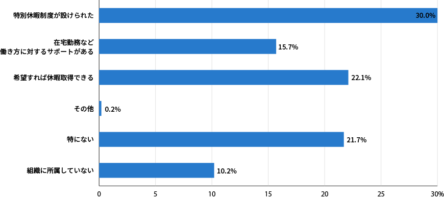最も多かったのは「特別休暇制度が設けられた」というものが30%、続けて「希望すれば休暇取得できる」といった結果が22.1%と、約半数以上の方がいわゆる「ワクチン休暇」という形でのサポート制度をあげられました。一方、残念ながら組織からのサポートは「特にない」という意見が21.7%という結果も出ています。