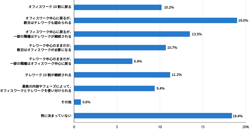 「特に決まっていない」という回答を除けば、最も多かったのは「オフィスワーク中心に戻るが、数日はテレワークが認められる」という方針で19%となりました。また、「オフィスワーク中心に戻るが一部の職種はテレワークが継続される」、「オフィスワーク10割に戻る」という回答を含め、オフィスワーク中心に戻す方針が4割強と、オフィス重視の意向が強いことがうかがえます。一方、約7割がオフィスワークとテレワークを組み合わせた「ハイブリッド勤務」になる見込みであることが分かりました。状況に応じてテレワークを有効活用する動きは新型コロナ収束後も続きそうです。