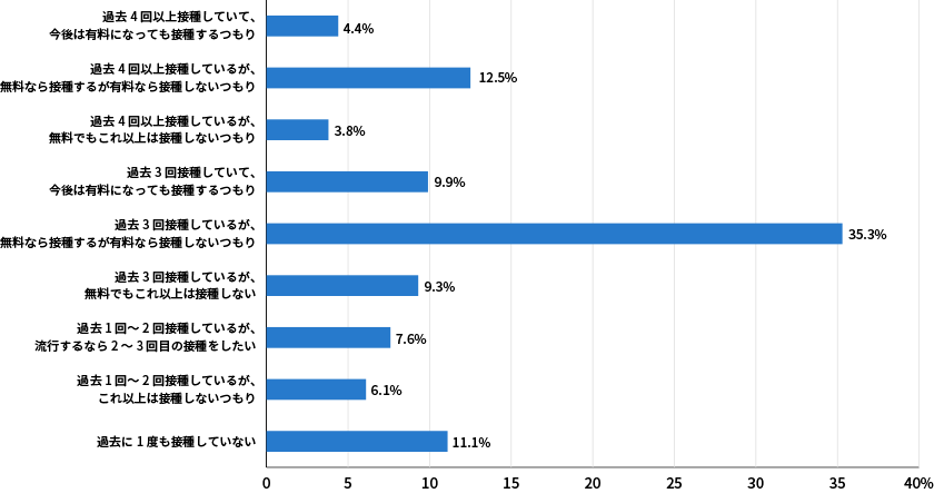 アンケートの回答を、有料か無料かの観点で見てみると、「有料でも接種する」という回答は14.3%。「無料であれば接種を考える(有料なら接種しない)」という回答は47.8%となり、「今後の接種は考えていない」と回答された方が19.2%でした。