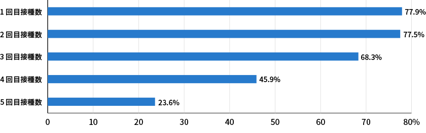 このアンケート調査の結果を踏まえつつ、デジタル庁が発表しているデータを見てみると、接種回数が増えるにつれ、接種率が減少していることがわかります。一定数ワクチン接種を行っているものの、有料であれば接種しないという声も多いことから、今後有料になるかはまだ発表されていませんが、5類への移行後はコロナワクチンを接種する人の割合は現在以上に減っていくのではないかと推測されます。