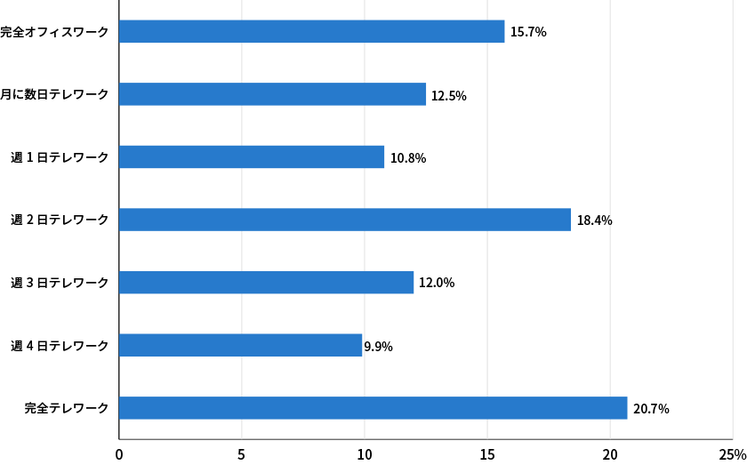 調査の結果を見ると、完全オフィスワークを希望するという回答は15.7%。逆に、月1回でもあったとしても、テレワークを希望するという割合は84%となっており、なかでも完全テレワークを希望する声は20.7%と最も多い回答となりました。