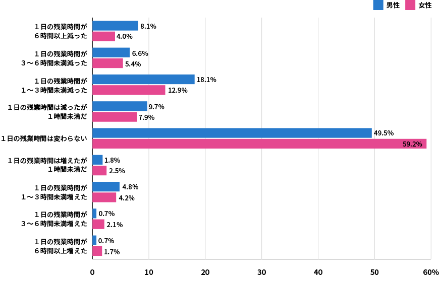 アンケートの結果を見ると、男性の4割、女性の3割程度は残業時間が減ったと回答されています。また、男性の49.46%、女性の59.15%が「残業時間は変わらない」と回答しています。こうしてみるとテレワークで残業が増えてしまったという方はそう多くないように思います。ですが、男女ともに1割程度は残業時間が増えてしまった方もいるようです。
