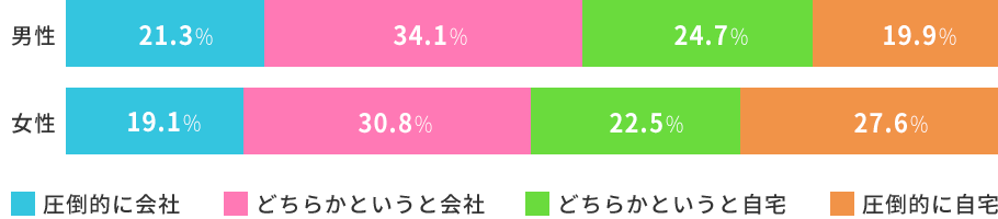 アンケート結果を見ると、なんと回答結果がきれいに分かれました! 男性はやや「圧倒的に会社」「どちらかというと会社」と答えた方が多かったものの、結果を見ればオフィスのほうが働きやすい方と自宅作業のほうが効率よく働けると感じている方はだいたい半々のようです。