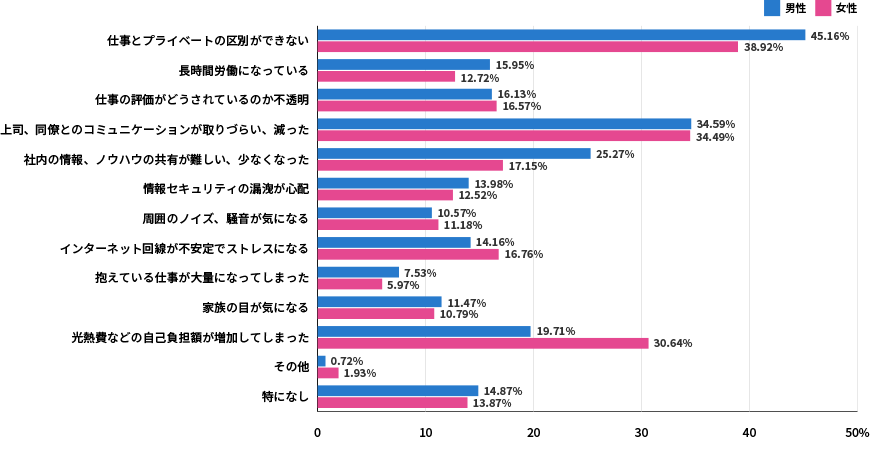 「効率が下がった」という回答はないものの「周囲のノイズ、騒音が気になる(男性10.57%、女性11.18%)」「家族の目が気になる(男性11.47%、女性10.79%)」といった回答からは、作業への集中を妨げる要因を読み取ることもできます。
